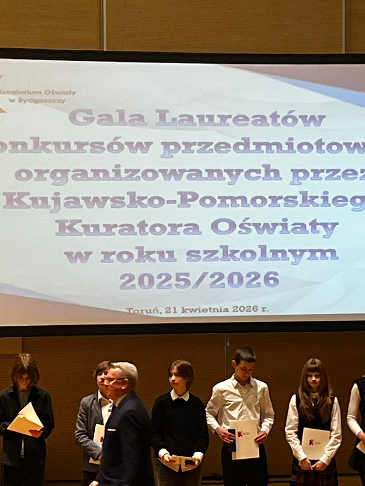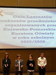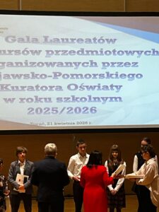 W dniu 21 kwietnia uczeń naszej szkoły Olaf z klasy VIII B (opiekun p. Kalina Strzyżewska) miał zaszczyt wziąć udział w uroczystej Gali Laureatów konkursów przedmiotowych organizowanych przez Kujawsko-Pomorskiego Kuratora Oświaty.